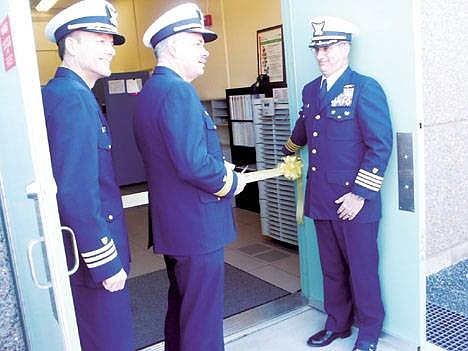 2. Rear Admiral Jeffrey Garrett, U.S. Coast Guard 13th district commander (center) prepares to cut the ribbon during the Thursday morning ceremony to honor the installation of a new generation of equipment at the LORAN-C Station in George.