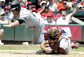 Catcher Mike Matheny absorbed a collision from Boone, hanging on to the ball.