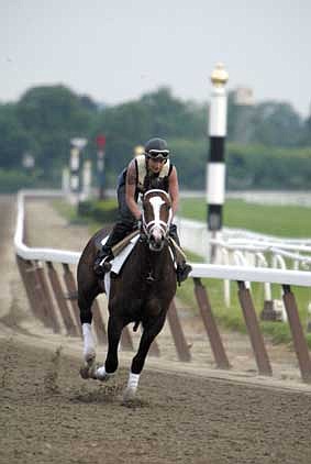 His first gallop around the sprawling track was cause for commotion Thursday. More than 100 reporters and photographers tracked him, even when he simply stood in his stall gazing back at the crowd.