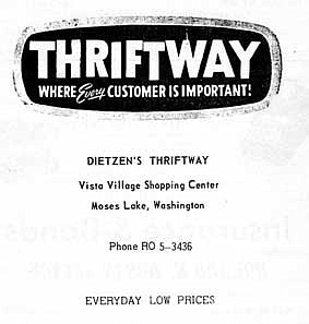 Located in the Vista Village Shopping Center, Dietzen's Thriftway Market featured "everyday low prices" and "Where every customer is important." The ad, above left, appeared in a cookbook published by the Moses Lake Woman's Club. We will feature recipes and ads from the book in future weeks. The cookbook is courtesy of Bill Ecret.