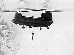 A seriously injured climber, in this image from video, who had been stranded on Mount Rainier in Washington is rescued Monday, May 17, 2004, as an Oregon National Guard helicopter takes advantage of a sudden break in the clouds to retrieve him. Peter Cooley, 39, of Cape Elizabeth, Maine, fell 30 feet early Saturday on Liberty Ridge, one of the most difficult routes up the 14,410-foot mountain. His climbing partner, Scott Richards, 42, also of Cape Elizabeth, was able to reach him, set up a tent, and call for help on a cell phone. (AP Photo/King-TV)