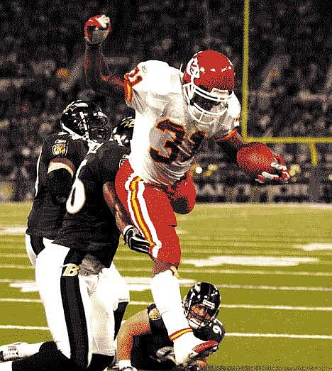 The Chiefs dominated a highly touted Baltimore defense with a formidable display of ball control. Priest Holmes ran for 125 yards and two touchdowns, and Kansas City nearly doubled the Ravens' numbers in yardage and time of possession.