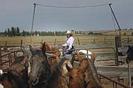 Mike and Robin work as a team to move the herd into the first in a series of pens and start with a rough sorting of the horses. Once the definite stay-at-homes have been removed from the pack, the real work begins. Mike dismounts and begins to sort the stock with an eye on horses that have been selected for their ability to buck and horses that may have come up lame in the pasture.