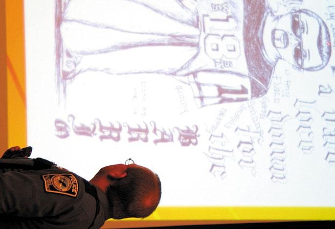 Parents and teachers should also be on the lookout for gang signs and gang graffiti. Winter said that gang graffiti doesn't have to be confined to the street, and can even be found inside a school notebook. Winter's presentation included a slide show, and he showed notebooks and other pieces of paper with gang-related imagery.