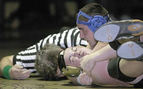 Knights' freshman T.J. Hunt was trailing Warden sophomore Joel Martinez late in the third round, but with a reversal, Hunt got Martinez in a pin hold and seemed poised for a comeback. Martinez was able to pull Hunt out of bounds and held on for the win.
