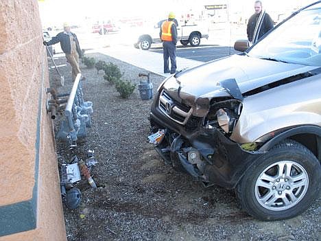 A Honda CRV driven by Nami Takagi, 38, of Moses Lake, collided with a Honda Civic as she was allegedly making a right-hand turn behind Blockbuster Video, Police Capt. Jim Jenkins said. The collision caused her vehicle to veer into the gas main attached to Blockbuster video on North Stratford Road. No injuries were reported.