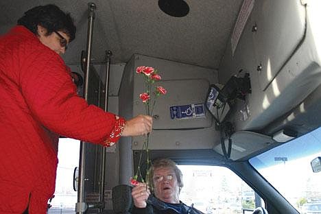 The riders on the Health Express bus were joined by the executive director of the Moses Lake Cancer Foundation before their trip to Wenatchee Valentine's Day morning, and DeBeaumont presented the riders and driver with carnations and candy in honor of the holiday.