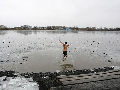 The rocks they tossed bounced across the thick ice covering most of the surface, save for a hole that had been cut to make room for roughly 30 people who would mark the beginning of 2006 by leaping into the cold water.