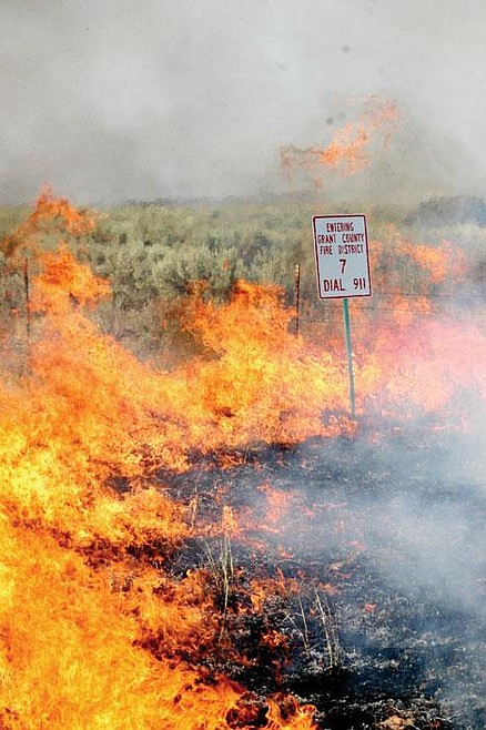 GRANT COUNTY — Just one day after record high temperatures scorched the Columbia Basin, two major wildland fires singed central Grant County Wednesday, the biggest burning more than 5,000 acres east of Ephrata.