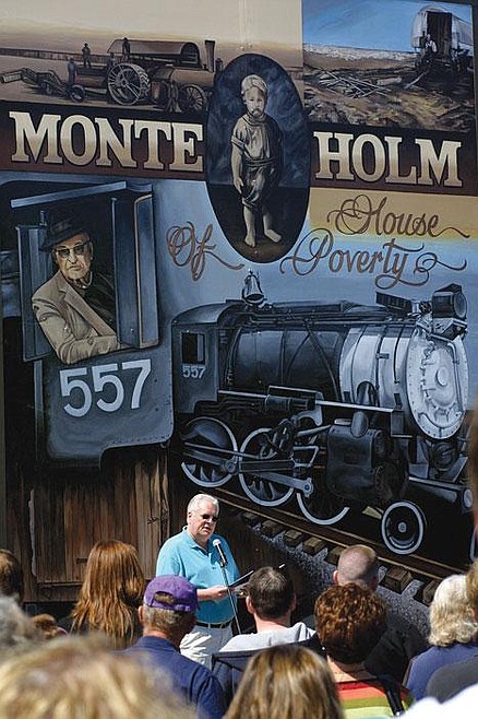 A crowd of more than 200 people gathered Saturday morning in Sinkiuse Square for a dedication ceremony of the mural depicting the life of Holm, longtime Moses Lake resident and businessman. The mural depicts various stages of Holm's life — as a 2-year-old, as a young hobo riding the train rails during the Great Depression, as a sheepherder in Montana and as the owner of his own rail line and museum.