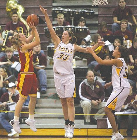 The Chiefs are trying to take advantage of Ann Noyes' excellent outside shot and want to set her up in the perimeter post, 5-8 feet from the hoop. Kamiakin's defense, however, wasn't having any of that strategy.