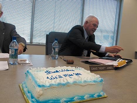 Commissioners Larry Peterson and Delone Krueger both hugged Jones after he banged his gavel for the last time. The port presented Jones with a farewell cake.