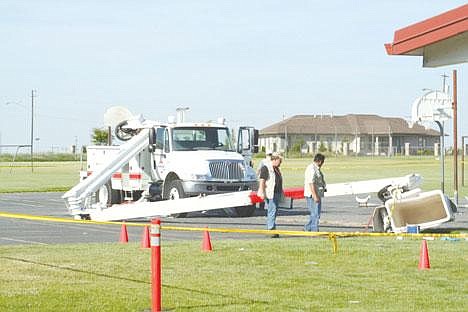 The pair were in the process of positioning the bucket when at 1:47 p.m. the boom came apart from the truck, sending the bucket crashing downward, according to Othello Police. When the boom arm hit the basketball court, it became embedded in the concrete by several inches.