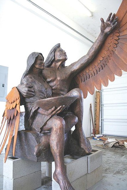 The bronze sculpture, referred to as "Calling the Healing Waters," features a man and a woman sitting upon a rock while the woman holds a bowl allowing water to drain through the bottom. Cast iron wings spread across the sculpted man's back with his hand extending toward the sky.