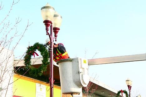 A Qwest utility worker hangs a wreath on Third Avenue in Moses Lake Friday morning. The Moses Lake Business Association, Moses Lake Christian Academy and Job Corps students hung wreaths, banners and lights along Broadway Avenue and Third Avenue including all the connecting streets. The holiday decor is an annual event. Photo by Candice Boutilier/Columbia Basin Herald.