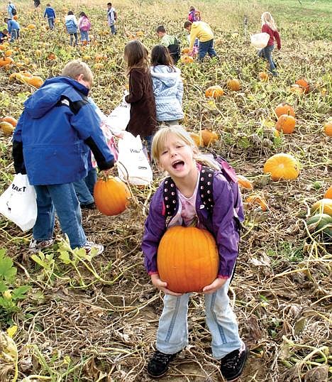 These are the sounds which filled the air at Joan Dopps' Moses Lake home Thursday morning, as second-graders from Peninsula Elementary scouted her pumpkin patch looking for the perfect pick.