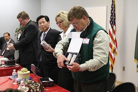 The Gunpo delegates presented Grant County officials with an art piece featuring cranes symbolizing long life, detailed cups symbolizing good health and fork, knife and spoon sets.