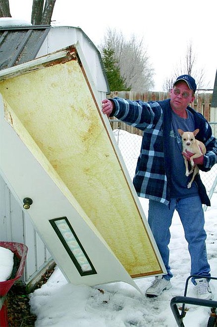 He had to board up the broken window and door. Towels are shoved near the bottom of where the door was to prevent a draft. Broken glass still remains in his yard.