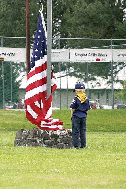 Following the parade at Lions Park, Cub Scout group 808 accompanied by Tom Tindell presented the flag to officially open the Fourth of July celebration.