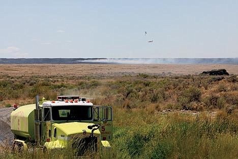 A plane and helicopter fly near each other as they drop water on a brush fire Sunday. The blaze burned several acres north of Moses Lake along Road 16 Northeast. Fire districts 7, 13, 5 and the Ephrata Fire Department fought the fire. The agencies battled the blaze into Sunday evening, leaving officials in the field and unable to comment.