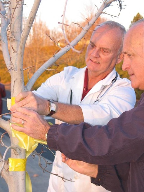 Samaritan Healthcare Respiratory Therapist Gary Lynch (left) and Community Development Coordinator Dave Campbell attach a yellow ribbon to a tree Monday in recognition of Veterans Day.