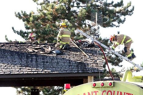 Firefighters climbed on top of the roof near the chimney and began dismantling a portion of shingles above an attic space with axes to prevent the fire from spreading.