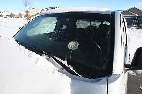 A man advised his windshield was struck by gunfire. He advised it appeared someone shot a firearm in the air and the bullet came down, landing on the windshield of his pickup, breaking it. The bullet was found in the driveway next to the vehicle and collected by police.