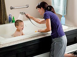 Getting into and out of the tub and shower can be difficult for little ones. And, as your "baby bump" continues to grow, the shift in your center of gravity can make you more susceptible to slips and falls. Permanent grab bars, such as SecureMount Grab Bars from Home Care by Moen, are an ideal solution, offering an easy, secure install in a variety of styles and finishes to beautifully coordinate with the rest of the bathroom. Or, for an even easier (and more temporary) installation, try Home Care's Premium SecureLock Tub Grip, which easily locks tightly to most tubs for an extra hand getting in and out. And, once you are in safely, consider adding a tub and shower seat to ensure that your bath time is accident free.