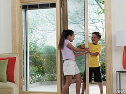 Another popular option is a sliding patio door. They don't swing, so they require less open floor space than a hinged door. A unique design from Pella puts the sliding panel on the outside - so when the wind blows against it, it creates a tighter seal, helping save energy. For added convenience and protection from insects, the self-storing retractable Rolscreen for sliding doors rolls out of sight when not in use.