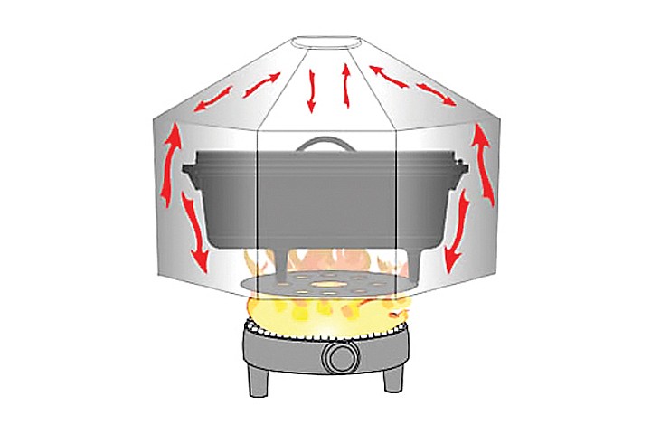 This setup allows the cook to prepare a meal in a Dutch oven without using briquettes or coals of any kind. The heat from the gas burner circulates within the dome and acts as if it was a convection oven.