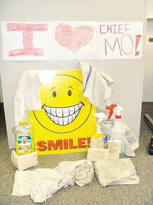No one had to worry about gathering the supplies because custodians Craig LeGrand and Jess Clem provided latex gloves and sanitizer. They sanitized and scrubbed the desks, counters, sinks, and white boards. On each white board the Friends of Rachel wrote, "Even though it took just a while, it was worth it to see you smile."