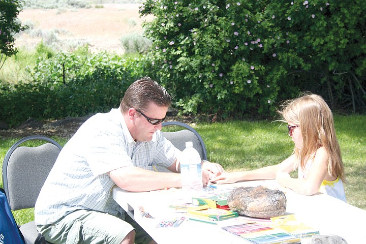 Matt Fountain of Kennewick was camping with his family at Sun Lakes State Park when they found out about Flood Fest. He took his daughter, Addison, 7, to one of the activities at the event - making necklaces out of arrowheads.