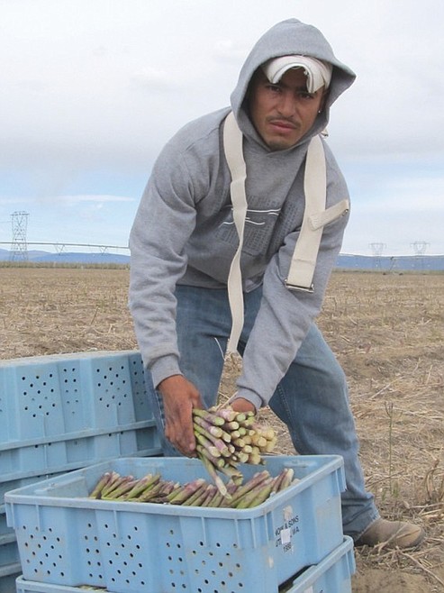 The crew includes Mary Venegas, who grades the spears. Cavazos weighs all of the harvest on site, and the nearly 500 cutters know their pay before the day is ended.