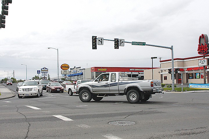 The four-way traffic light at the intersection of Valley Road and Stratford Road was flashing off and on Monday.