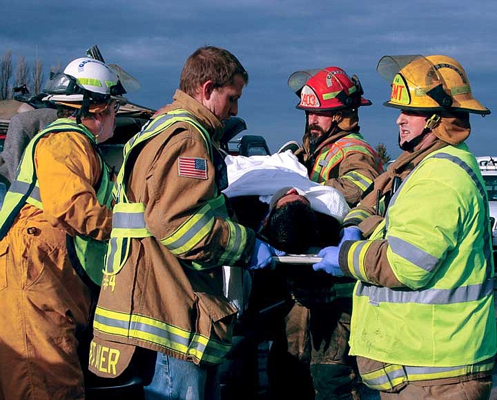 District No. 4 firefighters and EMS personnel swarmed all over the two vehicle involved in the "collision," using extraction tools to cut the roofs off and remove the "passengers," Hailey Yamani, Joseph Pruneda and Heidi Gonzales. Two of them were mock-injured badly enough to require a call to MedStar and a mock airlift from the scene.