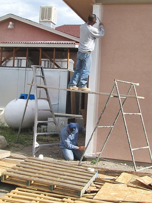 The expansion project at the Los Cu–ados grocery store in Mattawa is moving right along. Construction workers Jorge Soto, on ground, and Valentin Felix, both of Yakima, do some exterior finish work. When construction is finished, the store will be three times larger and will be renamed Mendoza's Market.