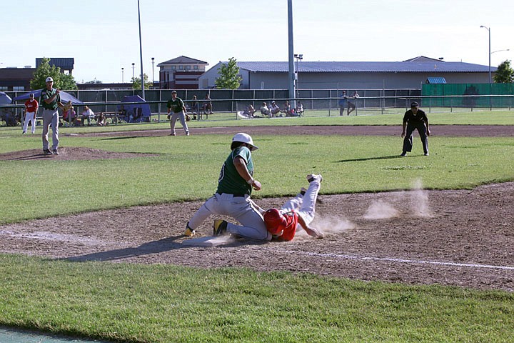 The Walleyes Jordan Lacelle puts the tag on a Sun Devil runner after being picked off first base in the top of the sixth inning in the first game of a doubleheader against Pasco. The results of the twin bill were not available at press time. Look for complete game coverage in Wednesday's edition.