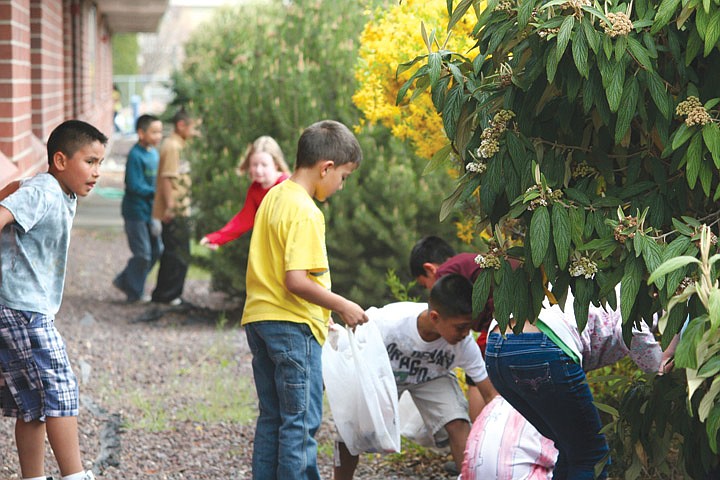 Red Rock Elementary took part in Earth Day 2012 in an event that saw more than one billion people in 192 countries participate. More than 700 K-5 elementary students helped clean up the campus on Friday, April 20, and then were rewarded with a cold soda supplied by Weinstein Beverage of Moses Lake. Mrs. Debbie Callahan's class tidies up in front of the school.