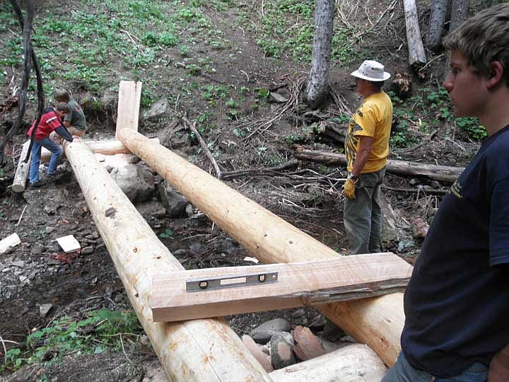 The sills and stringers were winched into place with the help of Scoutmaster Larry Hudson and Assistant Scoutmaster Paul Zeck. They worked under the direction of Jonah and David Poage of Cle Elum, who provided the trail engineering experience gathered from a lifetime of working on and recreating on Cascade Mountain trails.