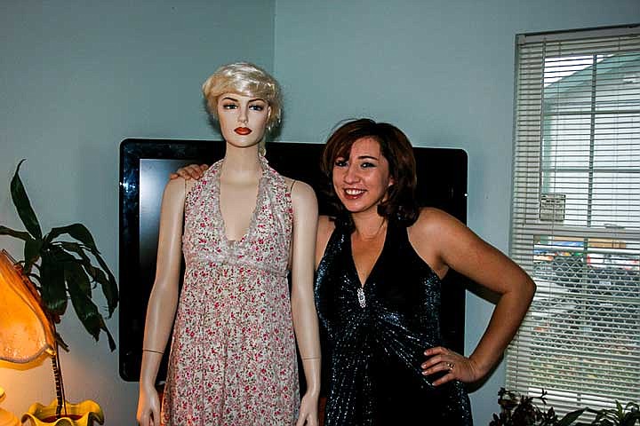 The black dress with spaghetti straps and white trim was the result of similar repurposing, starting with more donated material and some nylon netting, the kind used for sink scrubbers. The goal was to produce a collection of about 27 dresses, following the movie title, on a budget of about $70, she said.