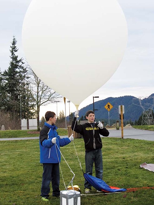 Pictured are eighth-graders Hayden Huss and Logan Gilbert on the verge of launching their Space Balloon recently. They chose to launch their space balloon in Issaquah because of the flight pattern they desired.