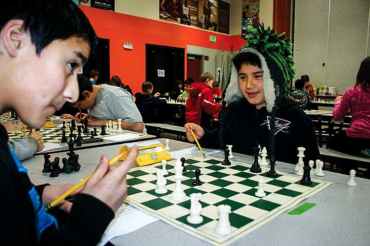The tournament was open to students in kindergarten through high school, and it drew participants from primary grades right up to juniors and seniors. Players lined up their kings, queens, rooks, bishops, knights and pawns and did battle. Every move was recorded on a chart provided by tournament organizers, and some games were so hotly contested that they spilled over into a second chart. Others went a little quicker. "Some players are really good. Some players don't know what they're doing," explained Luis Gomez, a sixth grader at Parkway who used to live in Moses Lake. His friend Garrett McLain taught him to play, he said, way back in fourth grade.