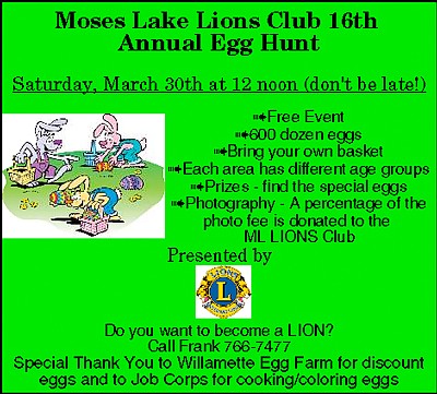 The 16th Annual Egg Hunt put on by the Moses Lake Lions Club will take place as planned in McCosh Park on Saturday, March 30th at 12 noon (don't be late!)