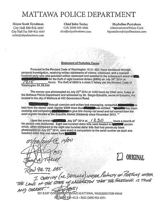 The Mattawa Police Department (MPD) conducted a sting at the Estudillo Market in Mattawa at noon on July 28 with the assistance of one of the suspects. The sting was conducted at the request of Sergio Estudillo the owner of Estudillo, Inc. which operates two food stores in south Grant County and one in the Yakima valley.