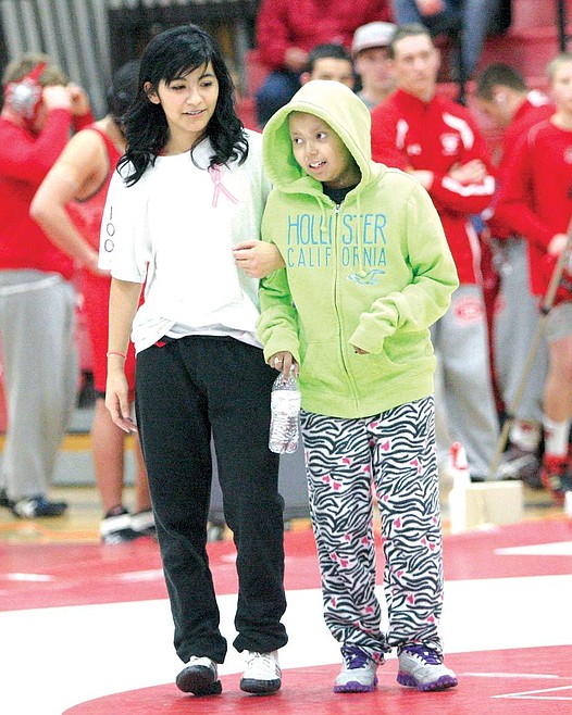 Clad in T-shirts that read "One day, one dream, one fight, one survivor," the girls wrestling team accompanied Chavarria on the center mat as she was presented with the donation.