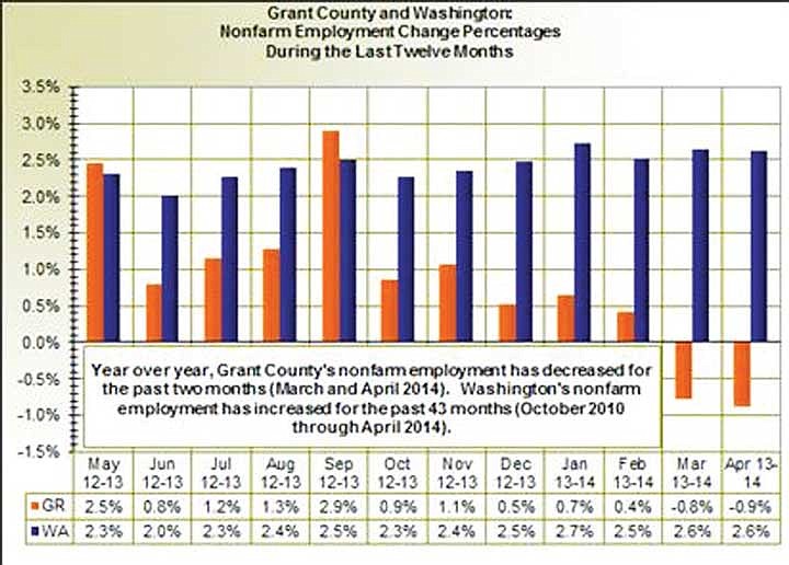 The sector tallied 11,300 jobs last April, but 11,850 jobs this April - an increase of 550 jobs. Meseck said a little over 80 percent of those jobs are in Grant County.