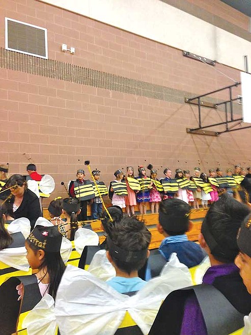 Students from Mrs. Robbins, Mrs. Montgomery, Mrs. Mueller, Mrs. Wood, Mrs. Manning and Ms. Leone's classes sang three songs in the gym at Red Rock. They were dressed as bees, complete with antenna and stingers.