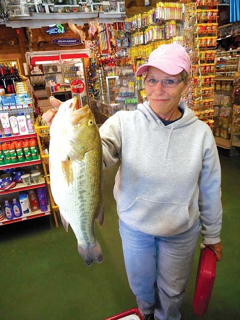 Jo Keyser of Wenatchee used the eyeball lure with a crawler to land her 6 pound largemouth bass while fishing off the MarDon Dock.