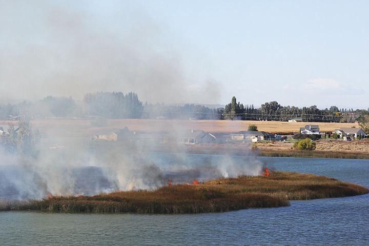MOSES LAKE - Some foliage on Crest Island in Moses Lake caught on fire Saturday morning.