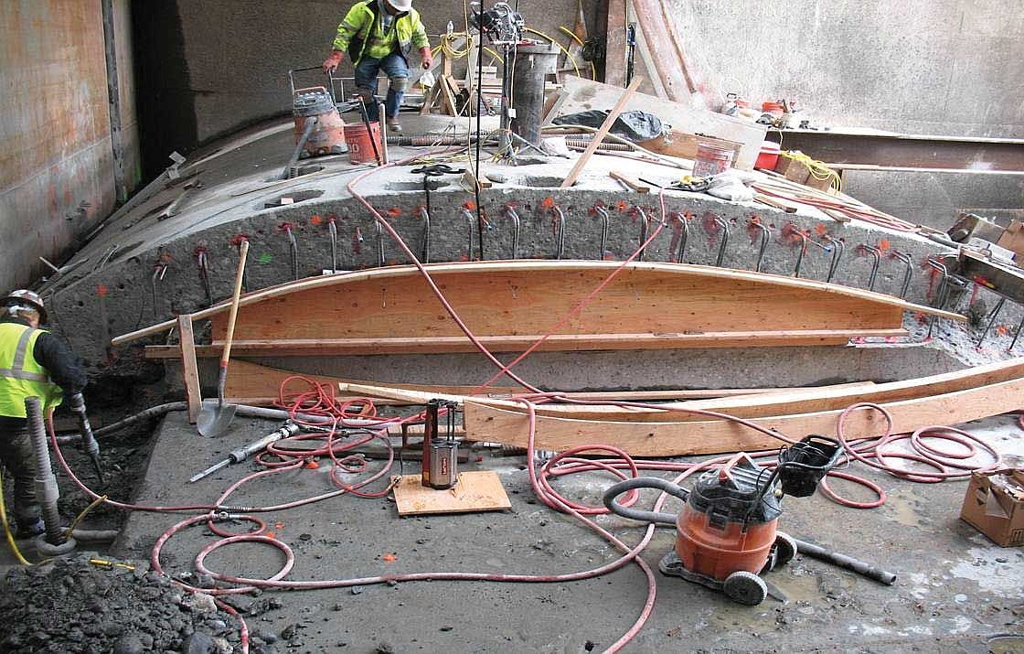 The repairs required reinforcing all spillway pillars, starting with holes drilled through the dam and into the bedrock. Cables were cemented into place and stretched out before being tied off.